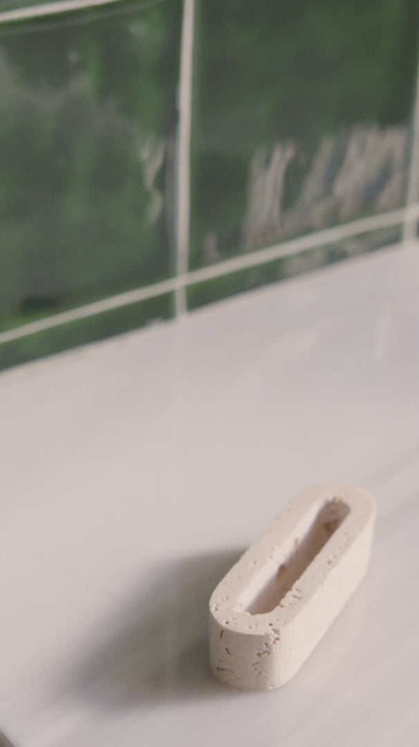 Place tongue scraper back into travertine stone holder.